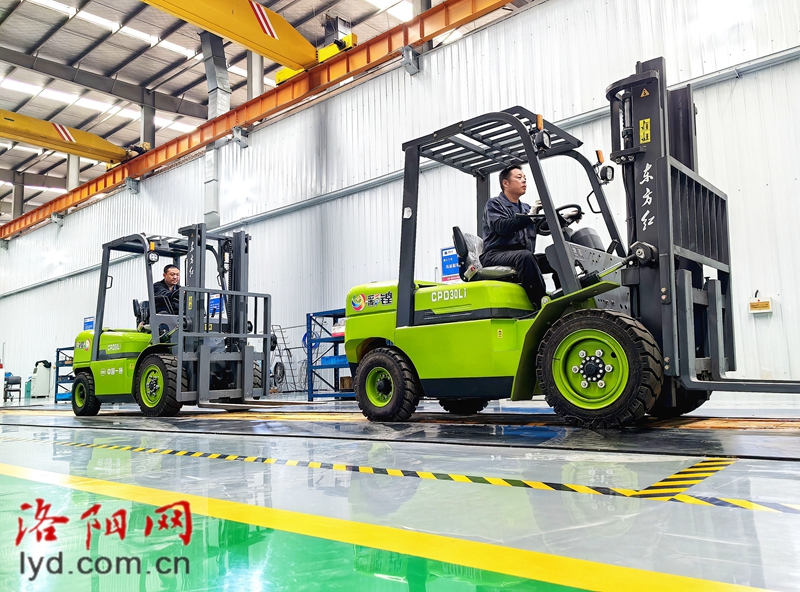 5月10日,在中國一拖集團有限公司特專車分公司,工作人員正在生產(chǎn)線上加緊生產(chǎn)、調(diào)試“東方紅”新能源鋰電叉車。